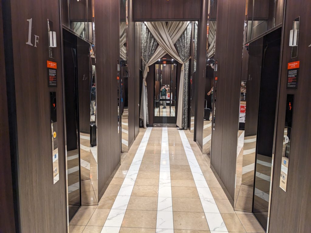 一つ一つの広さは狭めですが、6台もあるので、混んでいてもすぐに次のエレベーターが来ます。