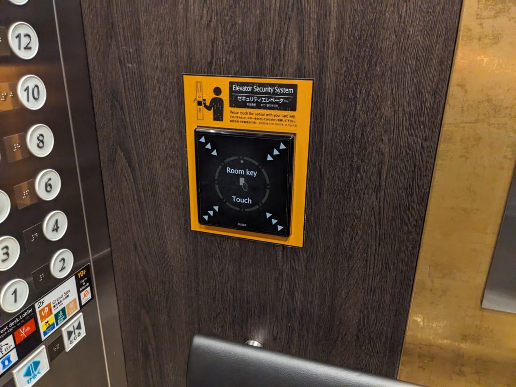 客室階へ行くには、自分のルームキーをかざさないとボタンを押せない仕組みになっています。