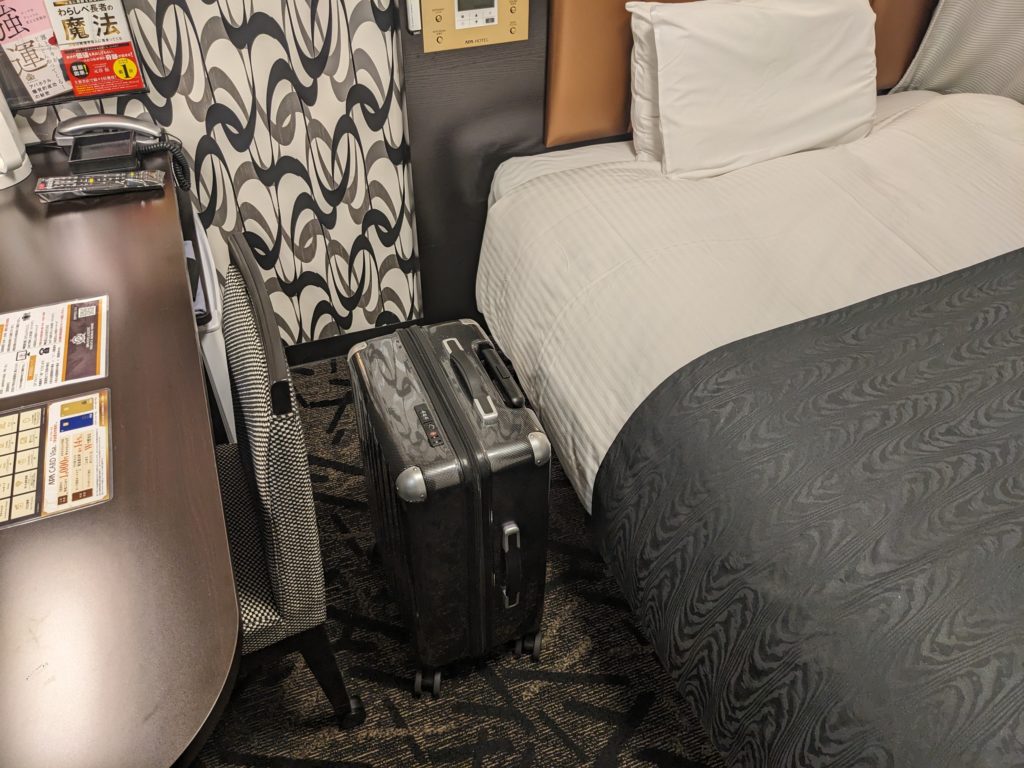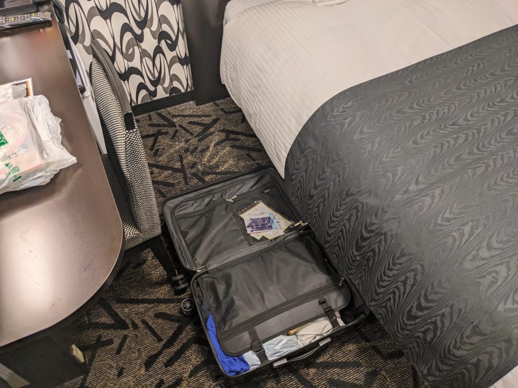 3泊用のスーツケース(47L)をベッドの脇に置くとこんな感じです。