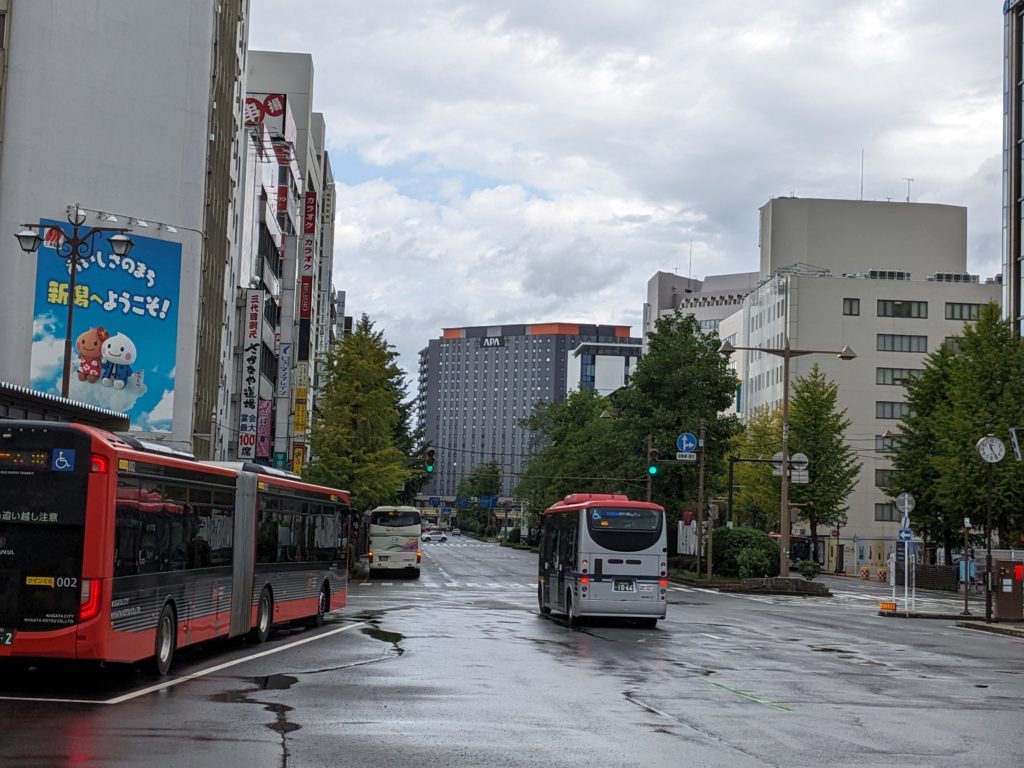 新潟駅前万代広場のバスロータリーから建物自体は見えますし、道も大通りをひたすら真っすぐ進むだけで到着します。