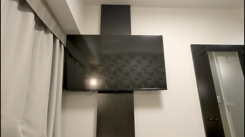 ベッドの脇には壁に沿って大型のテレビが備え付けてあります。